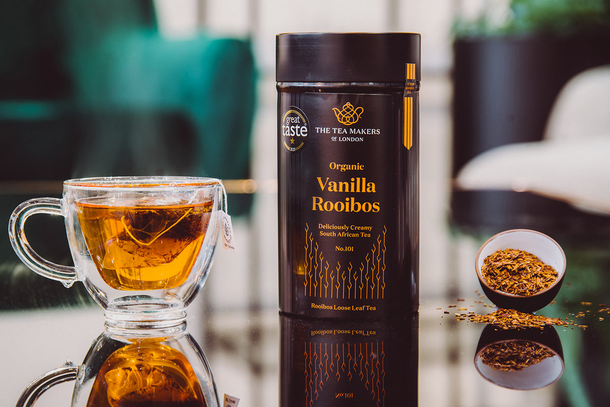 Our Great Taste award-winning Vanilla Rooibos loose leaf tea combines organic rooibos tea with organic vanilla pieces to create a creamy herbal brew. The vanilla adds a touch of sweetness to the cup, making it an all-round favourite.